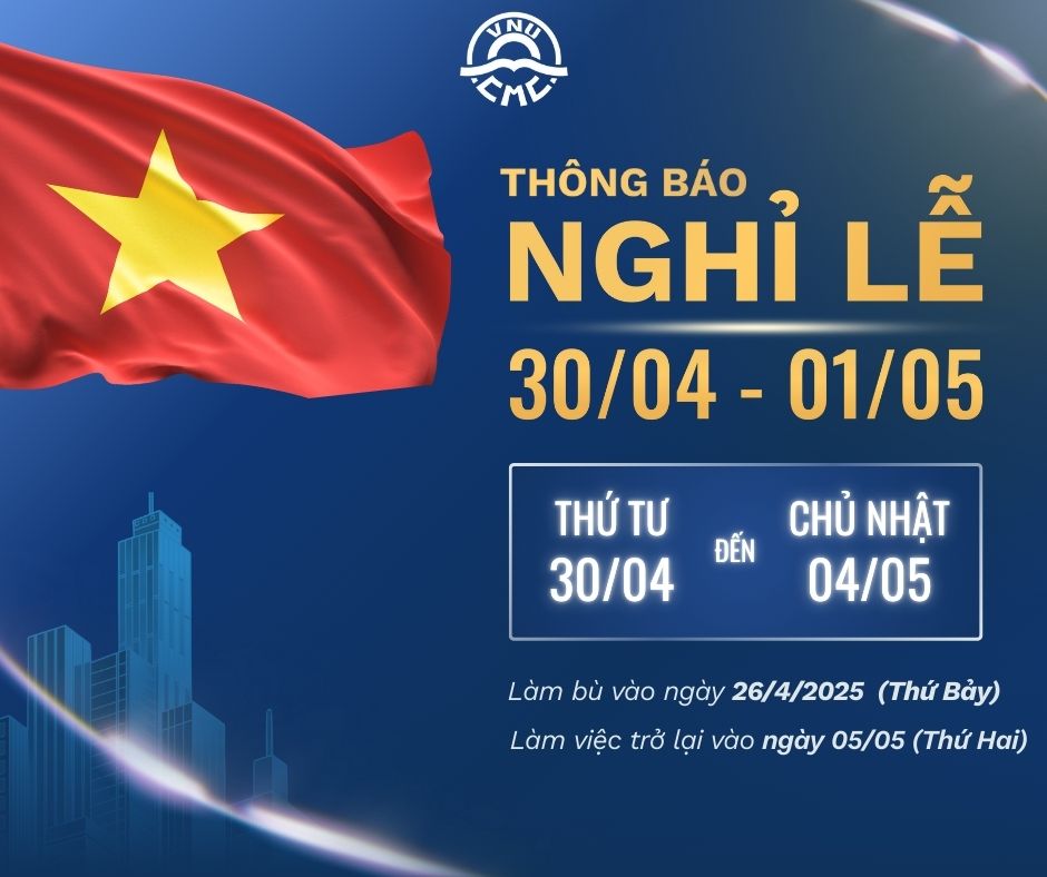 Trung tâm Quản lý đô thị đại học trân trọng thông báo lịch nghỉ lễ như sau: – Thời gian nghỉ lễ: Từ Thứ Tư 30/4/2025 đến hết Chủ nhật