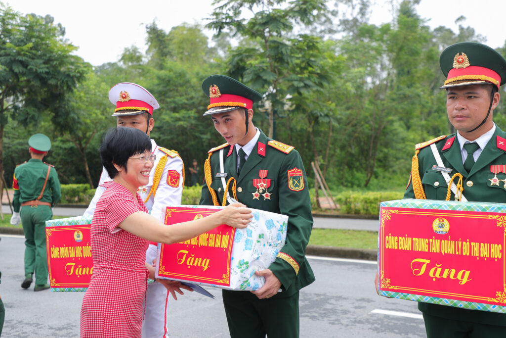 Đại diện Lãnh đạo Công đoàn, Văn phòng, Ban chức năng cùng Trung tâm Quản lý đô thị đại học, Trung tâm Thư viện và Tri thức số, ĐHQGHN tới thăm và tặng quà cho các cán bộ, chiến sĩ